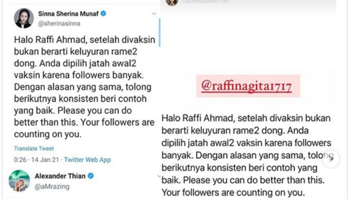 "Anda dipilih jatah awal-awal vaksin karena followers banyak. Dengan alasan yang sama, tolong berikutnya konsisten beri contoh yang baik," ungkapnya.
