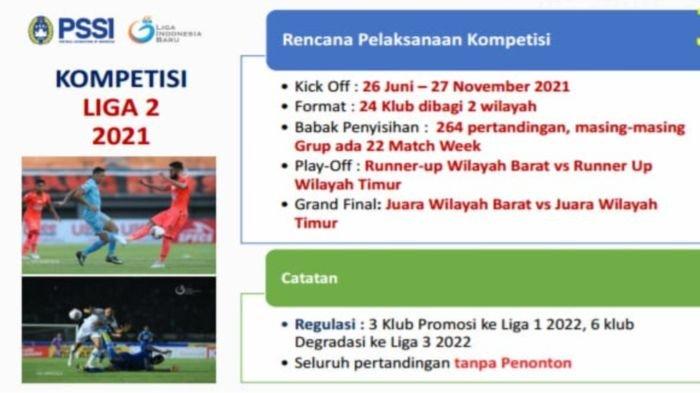 Regulasinya 3 Klub Promosi ke Liga 1 2022, 6 klub Degradasi ke Liga 3 2022. Seluruh pertandingan tanpa penonton.
