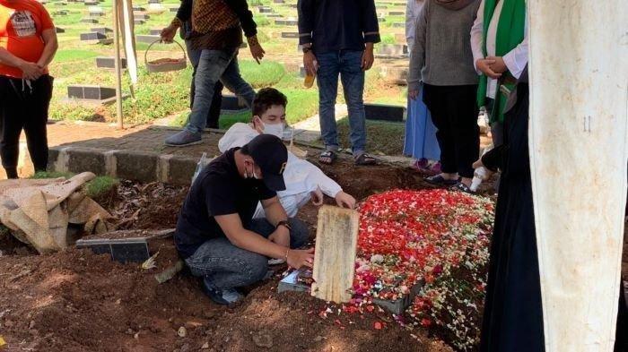 Selama almarhumah Jane Shalimar dimakamkan dengan protokol penanganan Covid-19, Muhammad Zarno terlihat duduk di dekat makam ibunya.
