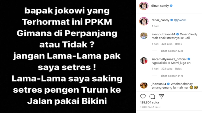 Ia juga menyebut bahwa aksi ini adalah bentuk kekecewaannya.Kendati demikian, dia meminta agar masyarakat tidak meniru aksinya berbikini. "Jangan tiru adegan ini, aku setres lagi cari pelampiasan," tulis Dinar Candy di akun @dinar_candy. Walau begitu, unggahan tersebut sudah tidak terlihat di akun Instagram Dinar Candy.