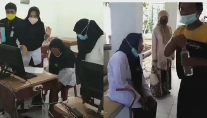 Beberapa petugas dan sesama peserta ujian juga turut membantu Ibu Imas menempatkan diri di kursi yang sudah disediakan.