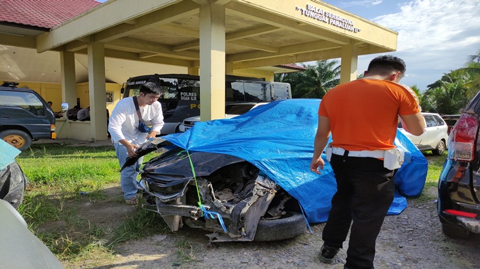 Setelah itu, pihak keluarga membantu polisi menutup mobil Honda Brio yang ringsek itu dengan terpal warna biru.