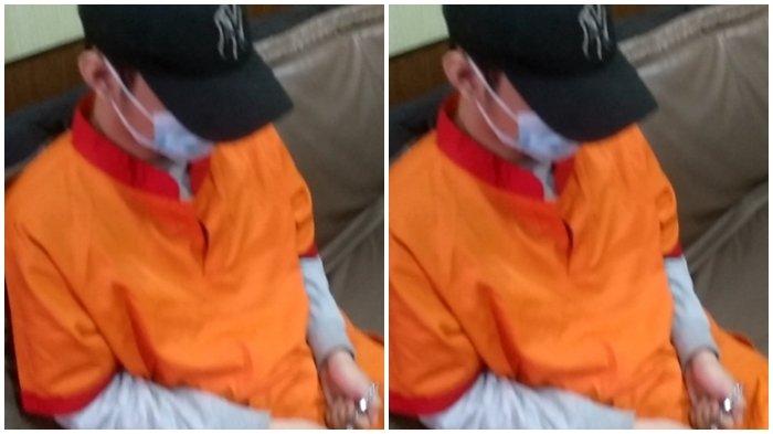 Dengan memakai baju bewarna Oren bertulisan tahanan Polrestabes Palembang dan jempol diborgol, Ubey pun hanya bisa pasrah