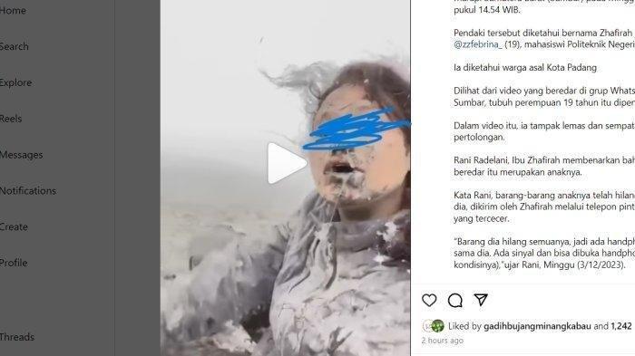 Video seorang pendaki perempuan yang diketahui seorang mahasiswi terjebak dalam Erupsi Gunung Marapi di Agam, Sumatera Barat, pun beredar dan viral di media sosial.