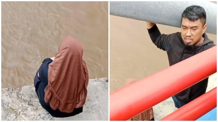 Tampak ada dua orang pria turun ke dekat sang wanita dan mencoba membujuknya agar tidak nekat melompat ke Sungai Musi dari atas Jembatan Musi IV Palembang.