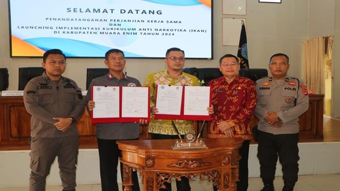 SRIPOKU.COM, MUARA ENIM - Guna mencegah peredaran dan penyalahgunaan narkoba terutama di kalangan pelajar, Badan Narkoba Nasional (BNN) Kabupaten Muara Enim menggelar Penandatanganan Perjanjian Kerjasama dan launching Implementasi Kurikulum Anti Narkotika (IKAN) di Kabupaten Muara Enim tahun 2024.