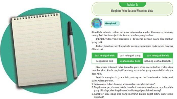 Pada buku paket Bahasa Indonesia kelas 9 SMP halaman 114 Kurikulum Merdeka, terdapat tugas Kegiatan 5 : Menyimak Video Bertema Wirausaha Muda, Menyimak.