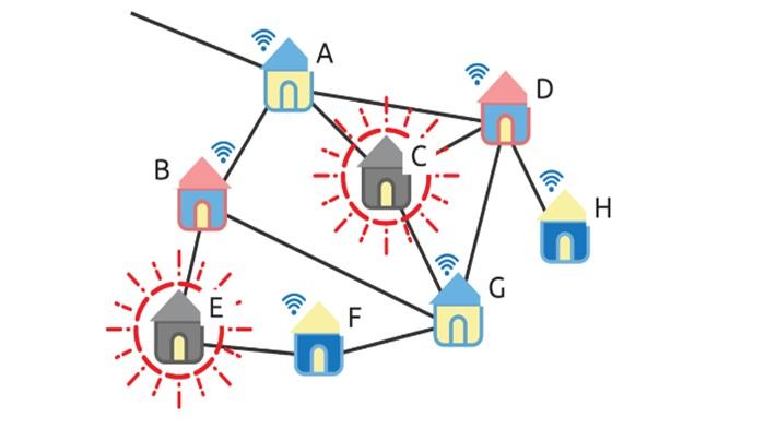 Deskripsi: Internet adalah jaringan komputer yang memiliki topologi jaringan tertentu yang mengarah pada hybrid topologi. Kasus: Sebuah jaringan internet dari rumah tampak seperti pada gambar berikut. Perusahaan penyedia internet memonitor terjadinya kesalahan komunikasi (communication error) pada dua rumah yang ditandai dengan gambar. Akibat dari kesalahan tersebut dua rumah tersebut tidak memiliki koneksi internet. Kesalahan komunikasi disebabkan oleh jaringan penghubung dari rumah ke rumah yang terputus.