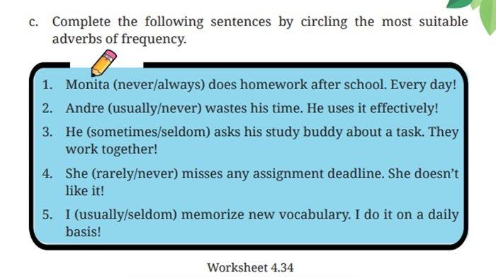 Melansir melalui buku.kemdikbud.go.id, silahkan pelajari dengan baik kunci jawaban Worksheet 4.34 berikut ini.