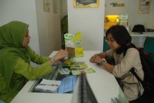 Yayuk (kiri) Customer Service Esia menjelaskan keunggulan HP Esia Hidayah kepada pelanggan setia Esia, Isni (kanan), di Gerai Esia Palembang Square, Kamis (26/8). Menurut Isni, dengan menggunakan Esia, silaturahmi sesama keluarga lebih terjalin karena sinyal yang tak pernah putus dan murah.