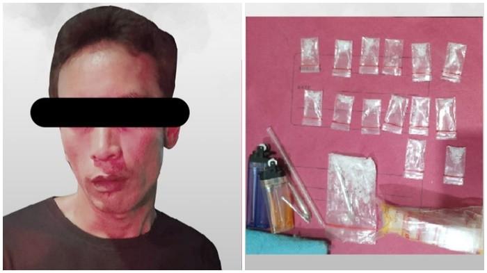 - Polisi menangkap HE dengan barang bukti sabu sebanyak 14 paket dan alat hisap sabu