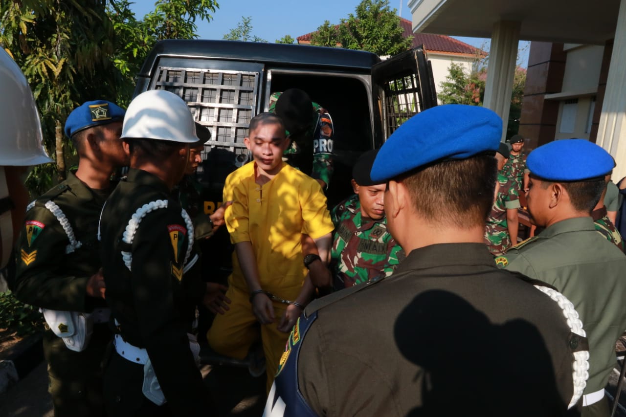 SIDANG PERDANA --Terdakwa kasus mutilasi Prada DP saat keluar dari mobil tahanan tiba di Pengadilan Militer I-04 Palembang