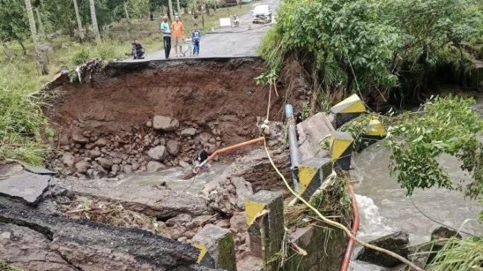 Kondisi ini menyebabkan gorong-gorong aliran sungai di bawah jalan amblas, yang mengakibatkan jalan terputus.