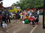 Beberapa di antara pemudik tampak duduk di jalanan beralaskan barang bawaannya.